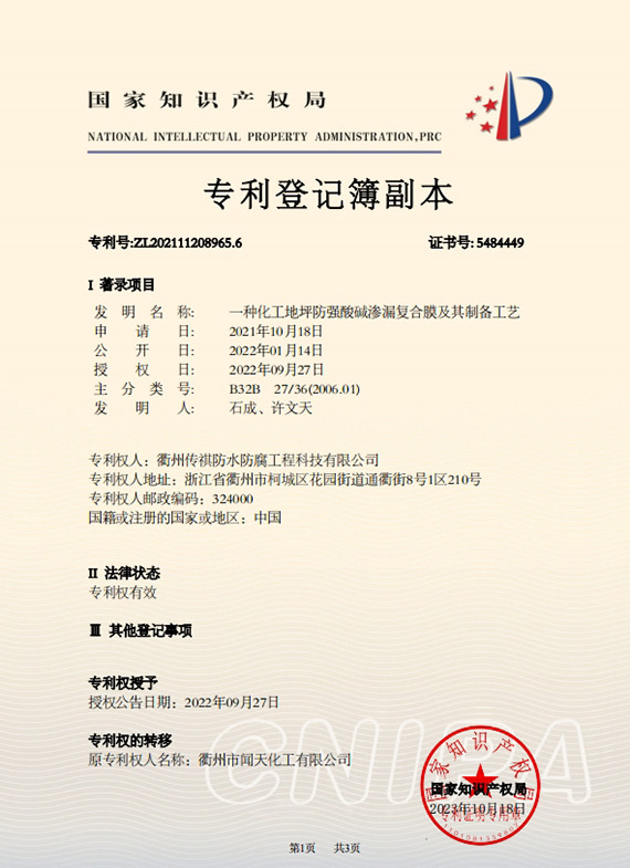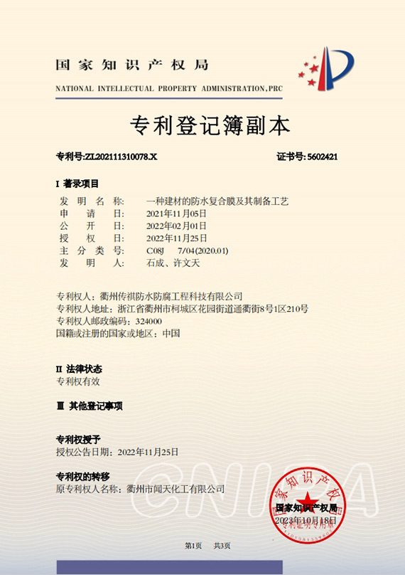 衢州傳祺新材料科技有限公司是衢州市聞天化工有限公司的下屬企業(yè);衢州市聞天化工有限公司成立于2003年,是國內(nèi)最早研發(fā)、生產(chǎn)氟碳涂料的企業(yè)之一。衢州傳祺新材料科技有限公司成立于2017年,公司專注于高分子氟材料的開發(fā)和含氟材料在防腐、防水領(lǐng)域的應(yīng)用。經(jīng)過6年的不懈努力,已獲得了化工和建筑領(lǐng)域六項(xiàng)國家發(fā)明專利授權(quán)和兩項(xiàng)新產(chǎn)品科技成果獎(jiǎng),參與了中國建筑材料流通協(xié)會(huì)《房屋修繕防水工程規(guī)范》標(biāo)準(zhǔn)的編制工作,中建協(xié)涂裝委員會(huì)浙西工作站設(shè)立在我公司。